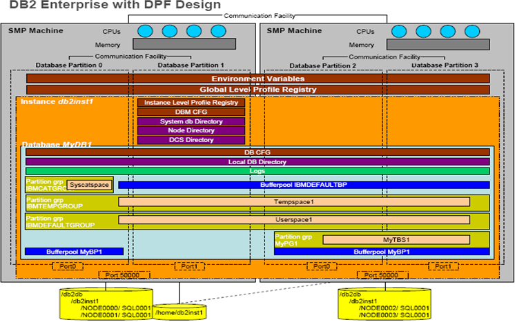 다중 데이터베이스 파티션에 생성된 데이터베이스는 사용자에게는 한개의 논리적인 데이터베이스로 인식되지만, 각 파티션에 물리적으로 데이터베이스를 생성한다. 파티션별로 생성된 데이터베이스는 일반적인 단일 데이터베이스와 동일하게 독립적인 자원을 사용할 수 있으므로 각 파티션은 버퍼풀, 잠금관리, 디스크등을 독립적으로 운영하게 된다.